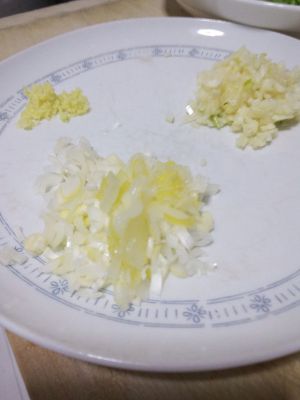 葱姜蒜切末,胡萝卜,尖椒切丝,木耳大的切丝,小的直接用就行了,备用