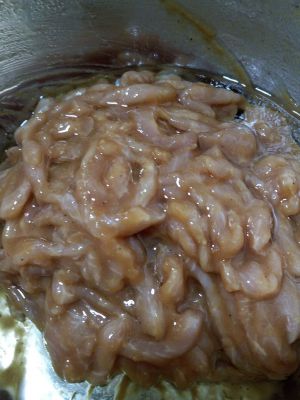 切好的肉丝浸水,冲净血水后沥干水分。放入盐、鸡精、白胡粉、酱油(放酱油使菜色更漂亮,但有些菜不适合放酱油,如:芫爆里脊丝等)和料酒将肉抓粘,下入鸡蛋清抓匀后加水淀粉抓匀封油。