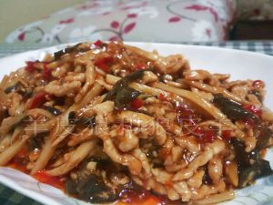 热锅凉油滑肉丝至断生。炒锅上火加油,三成油温下入红色剁辣椒(应该用泡椒,没有买到就放了剁椒。以前做过实验,对成品的影响不大,在家庭中完全可以替换使用。)出红油后放入斩碎的郫县豆瓣酱、葱姜末继续煸炒,待红油析出后下入滑好的肉丝和笋丝木耳,翻炒均匀后下蒜末倒入之前做好的汁儿,翻炒均匀。