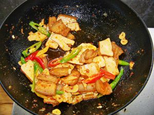 把锅中省下的油再次烧热,倒入青,红椒,香干翻炒至断生,加少许盐,倒入炒好的肉片翻炒。 加少许糖,鸡精,胡椒粉调味后起锅。