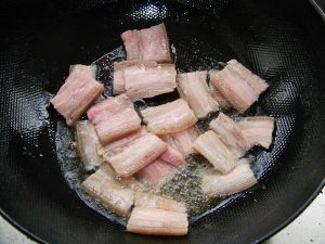 坐锅起油,下五花肉煸出油脂,捞起待用