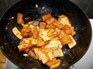 当豆瓣酱均匀的裹在五花肉上时, 再下入香干块;
