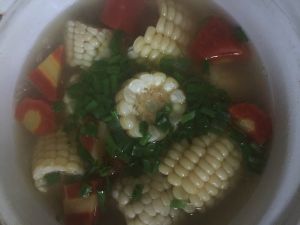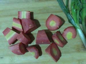 胡萝卜洗净切块,玉米切块,姜切片,香葱,切段