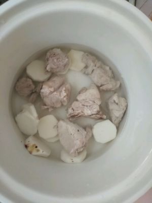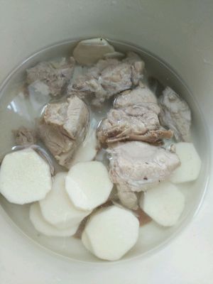 一根排骨洗净焯水下锅,淮山一节洗净一同下锅,加适量水