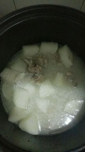 十分钟后,加入白萝卜,按下煮饭键,煮沸十分钟到半个小时,看萝卜的老嫩程度。