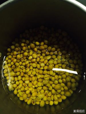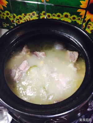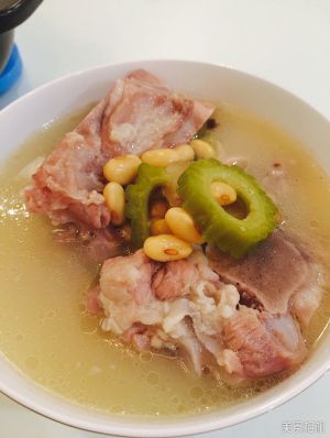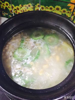排骨汤烧一小时后加入黄豆,炖至汤水浓厚。快好之后加入苦瓜炖。