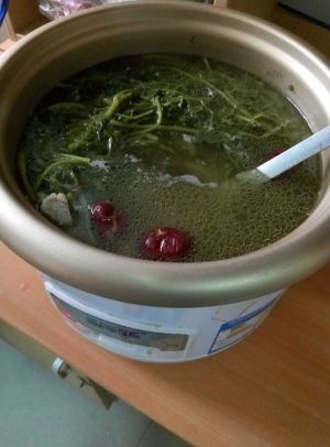 煲到西洋菜颜色变了,排骨烂了,红枣蜜枣都一压就裂后根据个人口味加适量的盐