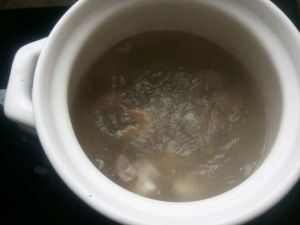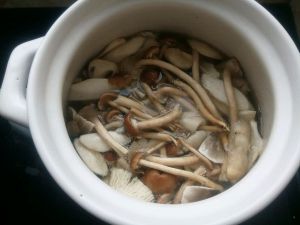 然后放入清水再次煮排骨,可以适量加一勺醋,这样不仅去腥,也可以使排骨肉比较容易炖烂。大火烧开后转小火波一个小时左右,加入杂菌,再熬一小时。