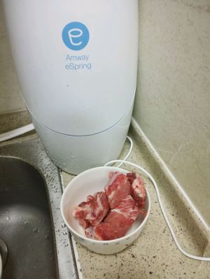 排骨用水烧开,烫一边,煮掉膻味,到掉第一道水。