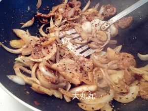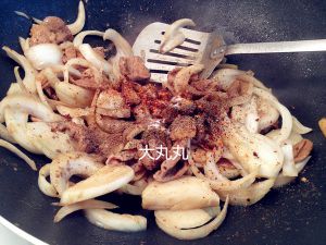 下入洋葱,并调入盐、砂糖、孜然、黑胡椒、辣椒粉翻炒至洋葱断生。