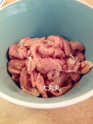 将羊肉切片放在器皿中,加入料酒、盐、少许水,搅拌均匀后再将葱姜放入,腌渍20分钟把葱姜去掉