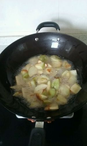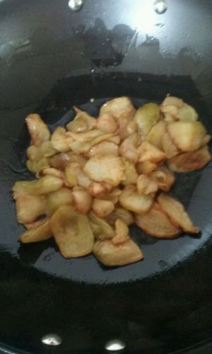 待油温烧成五成热时放入茄子进行翻炒至变软
