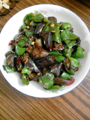 加的水几乎快干时,倒入青椒,放盐在青椒上翻炒一会,在和茄子混合,青椒炒熟,放入葱花,关火,出锅