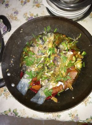 姜、蒜、西红柿、青辣椒切片,小葱、香菜切段,烧热锅里的油,下姜、蒜、干红辣椒炒香,再放西红柿、青辣椒翻炒片刻,加入适量生抽、一碗水,烧沸后放入炸好的鱼,散上小葱和香菜,盖盖子中火焖两分钟即可。