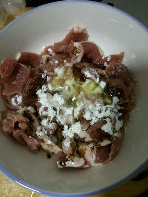 羊肉切片腌一下,放生抽,胡椒粉,淀粉,鸡精,盐,蛋清。