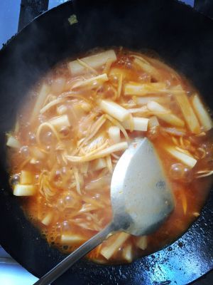 年糕加水加辣椒酱煮一会,汁收浓后出锅