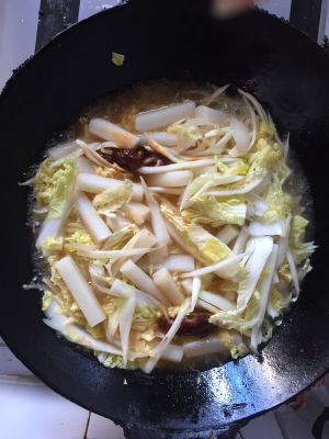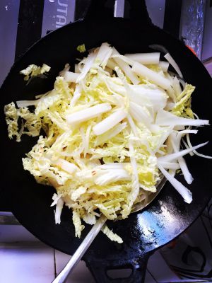 放入食材炒一会儿,白菜最后放,如果是现做的年糕,可以直接炒后放。