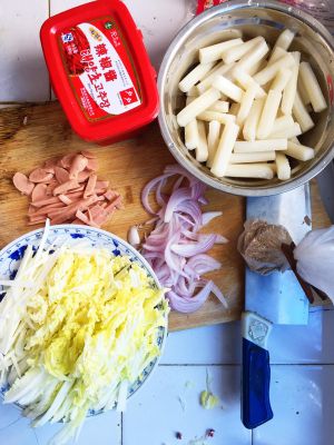 准备好食材,配菜一般要有白菜和洋葱,其他自由发挥,比如丸子,鱼饼,青椒,胡萝卜,鹌鹑蛋等等。年糕如果是真空包装的,建议用水泡几个小时或者煮三分钟。