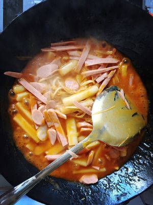 所以不需再加糖,如果用的是原味的韩式辣椒醬就要加糖唷:) 因為辣炒年糕吃起來要甜甜辣辣的才好吃!继续煮到滾接著放入年糕一直煮到湯汁收干浓稠為止最后加上葱段翻炒均匀起锅