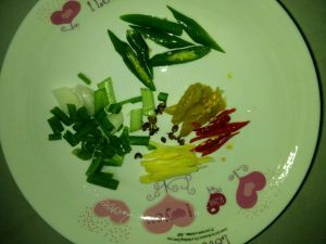 葱姜泡椒干辣椒切丝,尖椒切段,喜欢蒜香的朋友可以拍一瓣蒜,不喜欢太辣的朋友可以用红灯笼椒,这样颜色更加丰富。