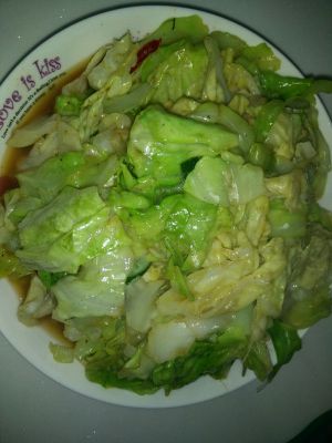 加入包菜翻炒,放入一勺生抽、一勺蚝油,继续翻炒至熟,加入盐、鸡精,1/2勺醋,一点点点糖(提味)