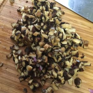 香菇用水泡发,如果时间比较赶可以用温水泡,将泡发的香菇挤干水分切丁