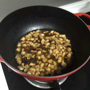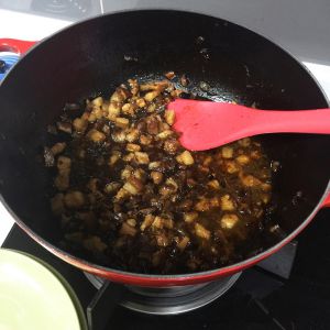 加老抽 生抽 耗油 翻匀,倒入香菇丁