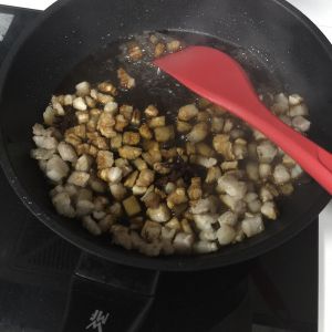 锅加适量油,倒入猪肉丁,加入料酒煸炒至颜色变白。如果用的肉偏肥就煸出油再继续