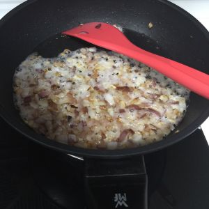 起油锅,待油烧热,倒入洋葱充分煸炒,去干水分,至其呈金黄色