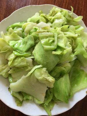 放入撕好的包菜一起翻炒至熟,然后放入盐,醋,糖和香油