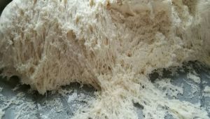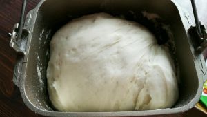 把清水、面粉、白糖、酵母从下到上放入面包桶,启动揉面程序。