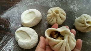 接下来发面团,将面粉和酵母粉、泡打粉、白糖、玉米油、牛奶、温水一起和面,然后将面揉至光滑,发面约30分钟,再搓成长条,分成等量的小面团,然后再擀成包子皮,将冰箱的肉馅取出,把它包起来。