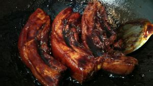 将五花肉切成丁,热㶽,倒入肉丁煸炒出油后,加入酱油,叉烧酱,蜜糖,起锅纳凉备用