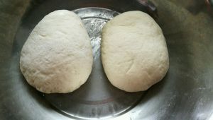 把醒发后的面团拿出来,分成小团子,擀成中间厚两边薄的薄片!