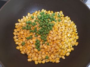 热锅冷油爆香姜末然后将煮熟的玉米和生豌豆粒一起倒入锅里翻/2分钟。