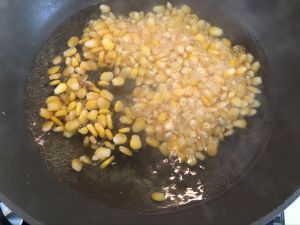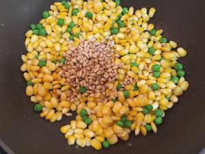 锅中到少许油,放入煮熟的玉米粒翻炒,加糖,盐不断翻炒。临出锅前放葡萄干和松仁。