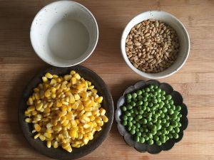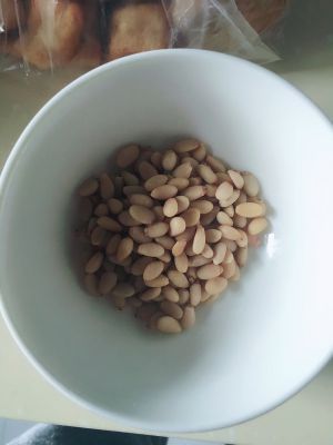 少许淀粉加入清水后稀释成淀粉水,准备好豌豆和熟松仁。松仁如果是生的,可以放烤箱180的烤5分钟左后至熟。
