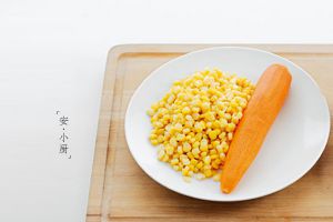 玉米粒和青豆淘洗干净,入沸水中煮熟捞出,沥干水分;胡萝卜切成碎丁。