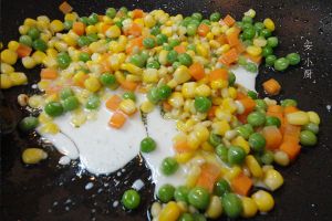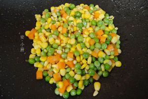 锅中倒入油加热至7成热时,放入胡萝卜丁、玉米粒和青豆翻炒片刻