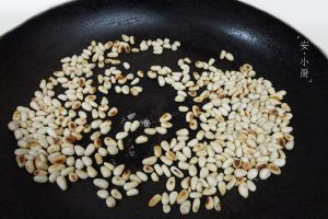 松子去壳去皮,取一平底锅,不放油和水,加入松仁小火焙香,待松子仁变微黄色,表面泛油光时,盛出自然冷却。(如果是熟松子仁的可以省略此步骤)