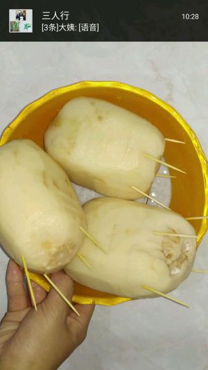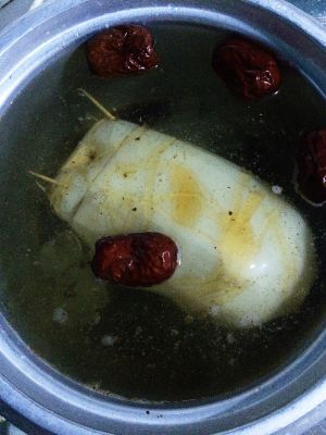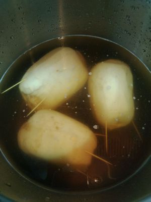 我用电饭煲煮的 里面放 冰糖 红糖 桂花蜜 还有几颗枣也被我丢在里面 煮了大概两个小时 用筷子不费力插进去就熟了