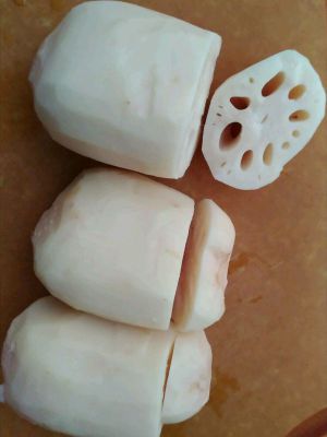 1.把藕洗净去皮,切掉前面3cm左右作为帽