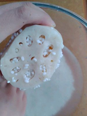 提前泡了两个小时的圆糯米,塞藕的孔里,可以用筷子帮忙哦~哈哈