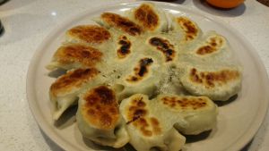 油热稍后,把包好后的饺子放入平底锅,中间要留有空隙,盖上盖子,听见滋滋响的时候倒入水,水量大约在饺子一半的位置,盖上盖子,直到水煎没后,把混合好的淀粉水,均匀的洒在锅里,薄薄的一层即可,凝固后,就可以出锅啦!