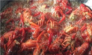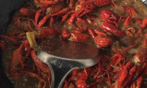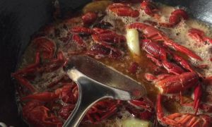 在加入小龙虾,放入香料炒几分钟。在加入啤酒以及适量的水煮开。