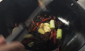 油少许,小火加热,依次放入干辣椒、大蒜、姜、蒜、花椒大料、郫县豆瓣酱翻炒煸香