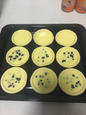 小提示: 也可以在倒入蛋挞液之前在塔皮中加入黄桃/葡萄干/蓝莓酱/紫薯就变成不同口味的蛋挞啦!