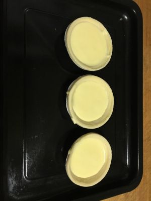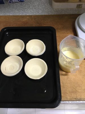 等挞液凉了,把蛋黄打散放进挞液里,分别倒进挞皮里,七八成满。