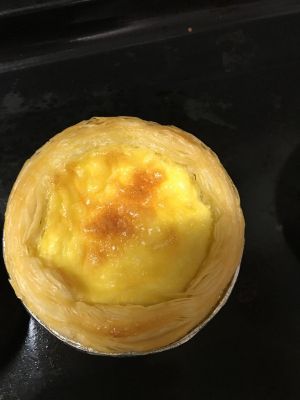 把挞水过一遍筛,再倒入挞皮里,8分满。 200度烤25分钟,这个时候已经熟了,颜色够了就不用再烤了,有的烤箱25分钟后蛋挞虽然熟了但还是白色,这个时候需要调整烤箱温度到220度,再烤3~5分钟。