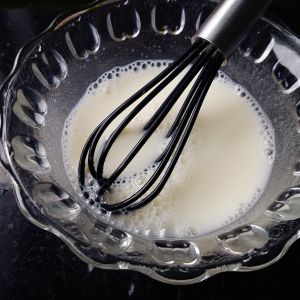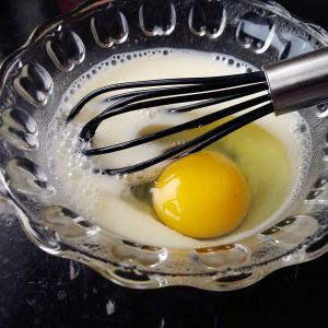 鸡蛋敲在容器里,手动打蛋器打散,加入牛奶继续手动打蛋器拌均匀